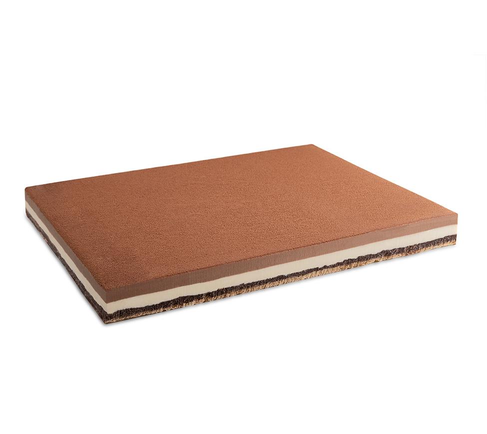 Biscuit moelleux, croustillant au chocolat noir, deux mousses chocolat blanc et chocolat au lait, décor velours. (31% de chocolats)