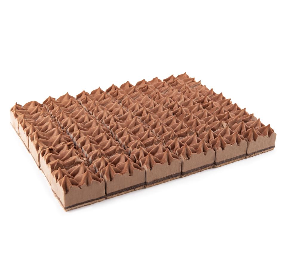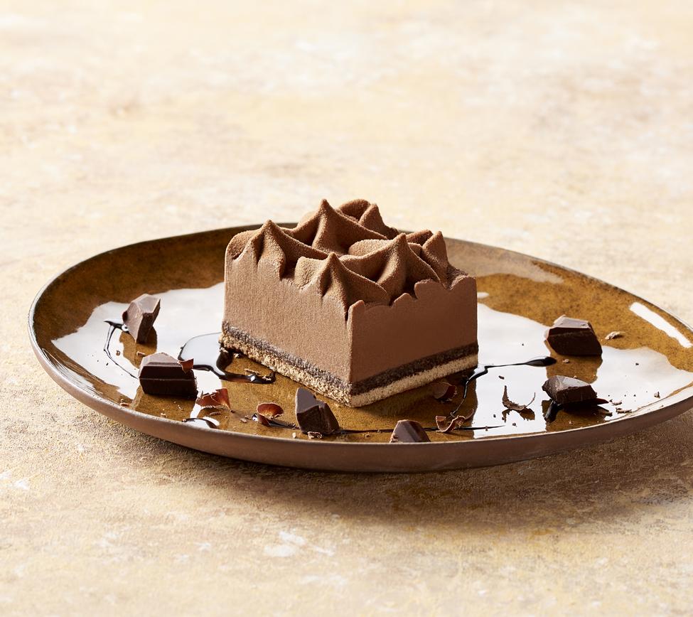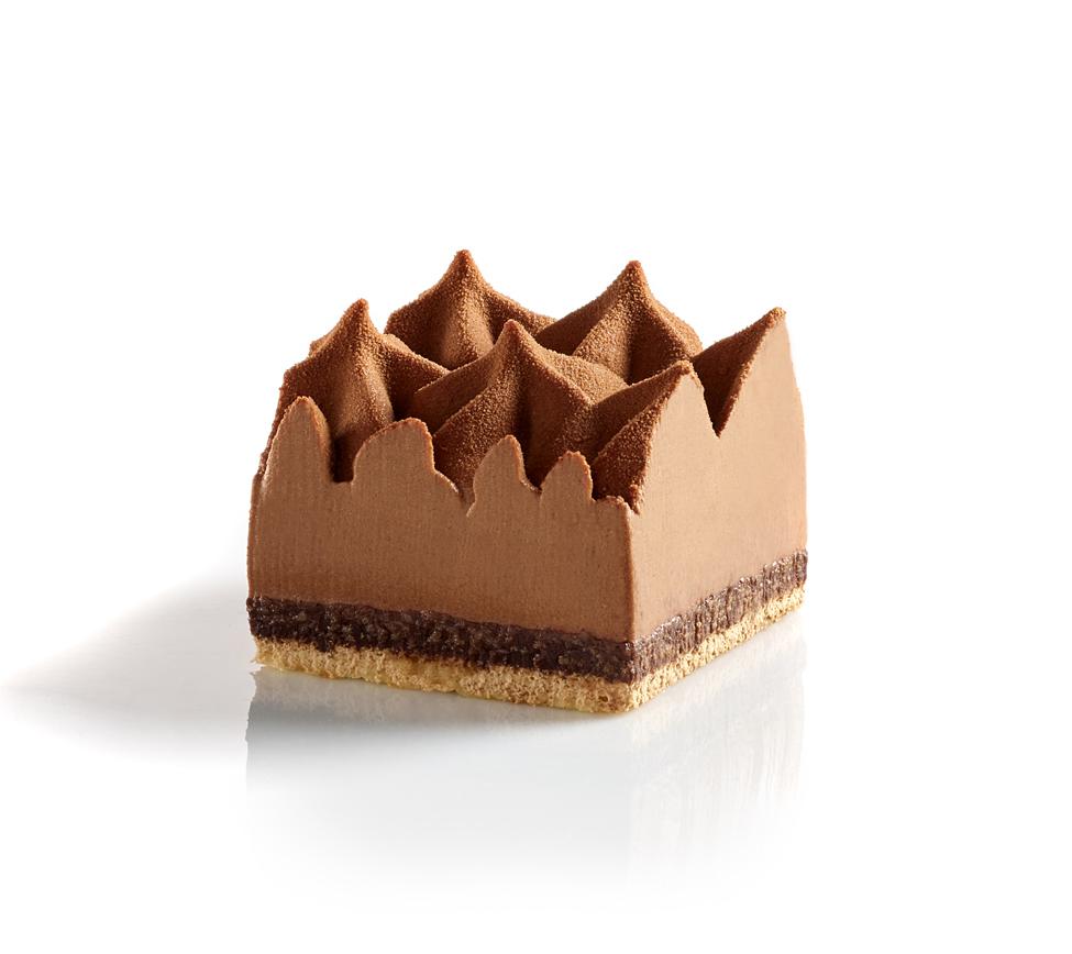 Biscuit moelleux, croustillant chocolat noir, mousse au chocolat noir intense, pochage cannelé et son décor velours cacao. (29% de chocolat)
