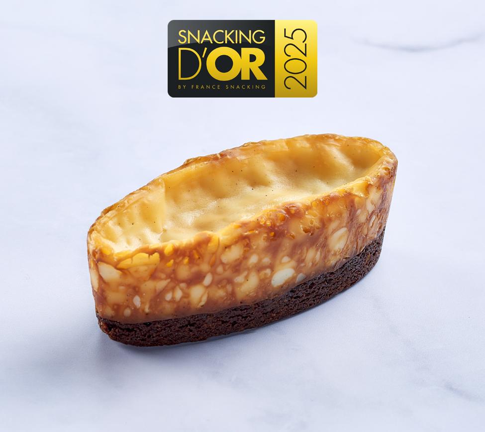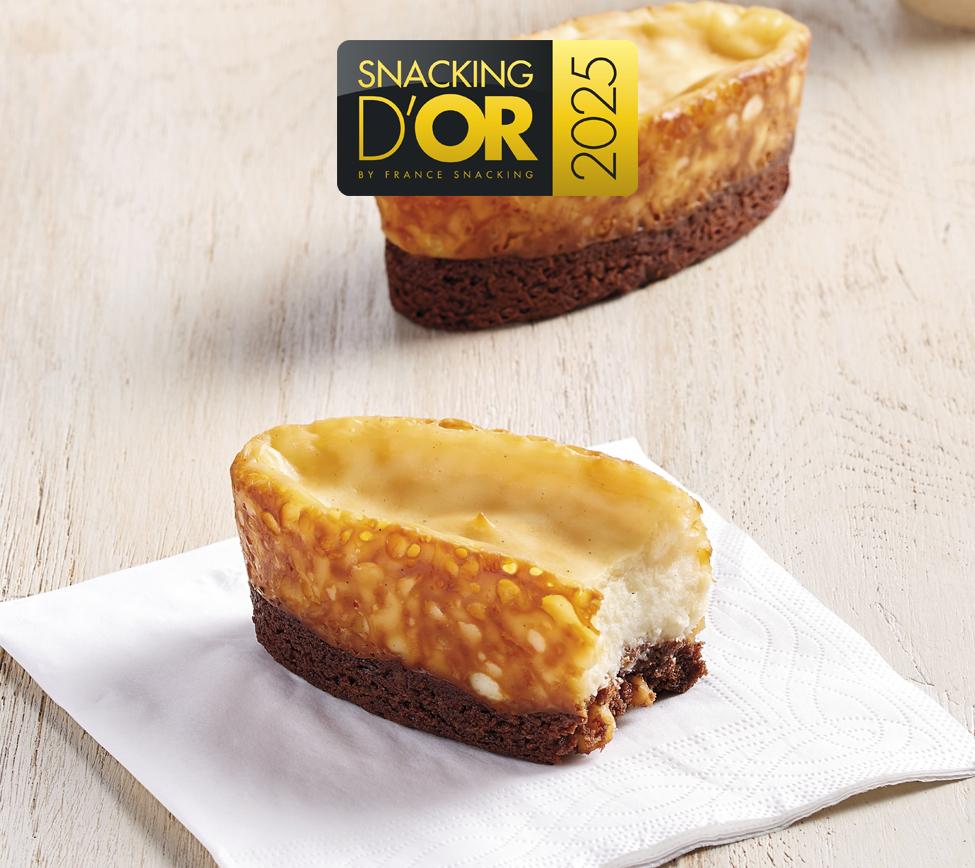 Base brownie aux éclats de noix surmontée d'une crème flan au bon goût de vanille.