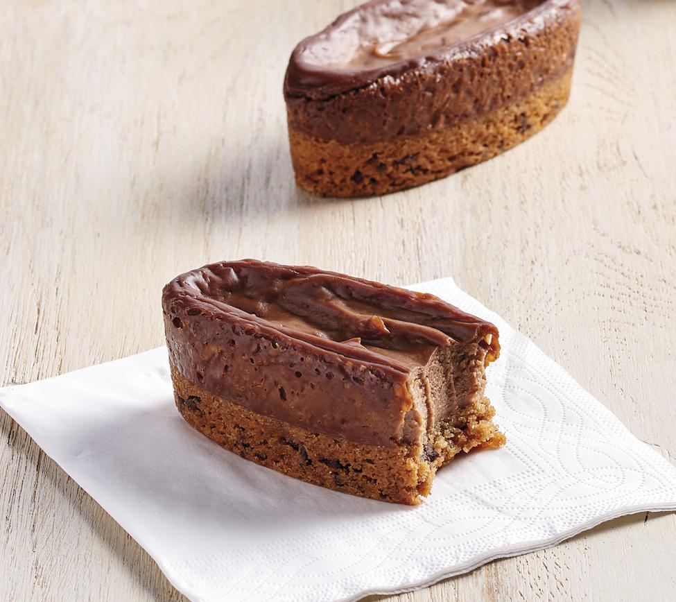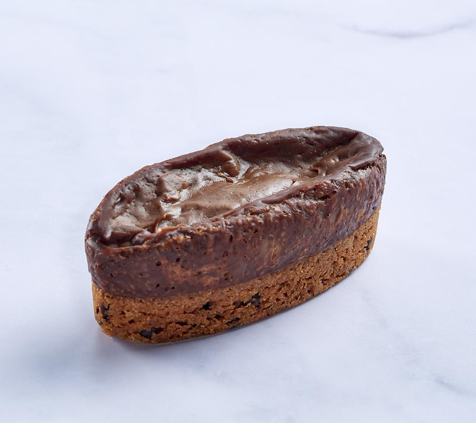 Base cookie aux pépites de chocolat surmontée d'une crème flan au bon goût de chocolat.