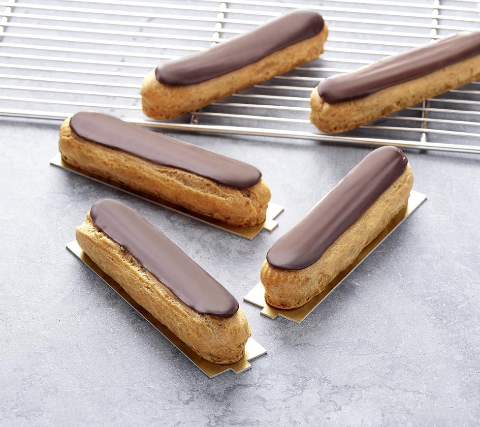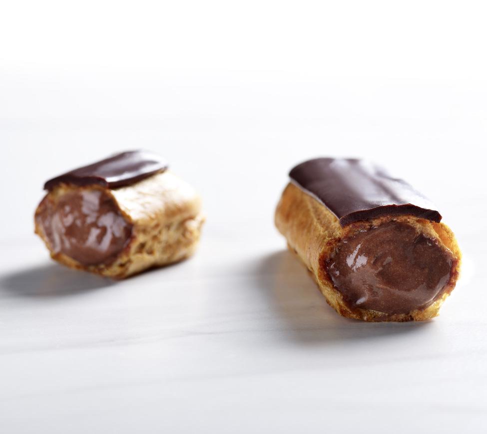 Pâte à choux aux œufs, garniture pâtissière, fondant au chocolat.