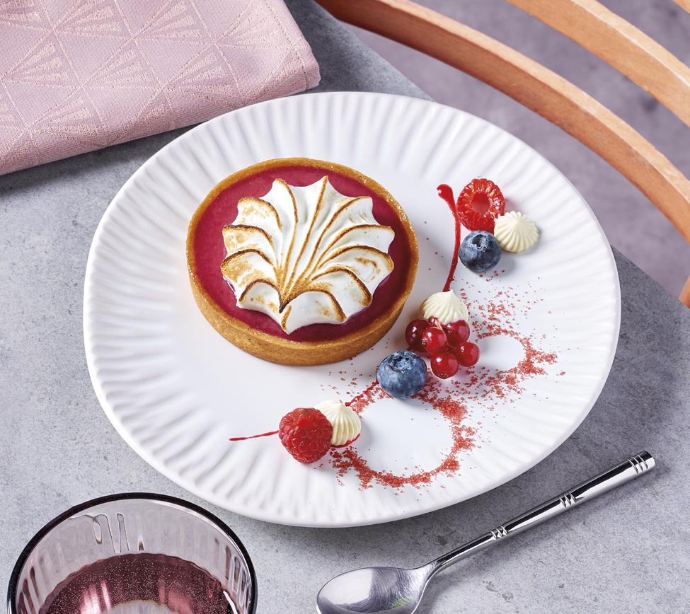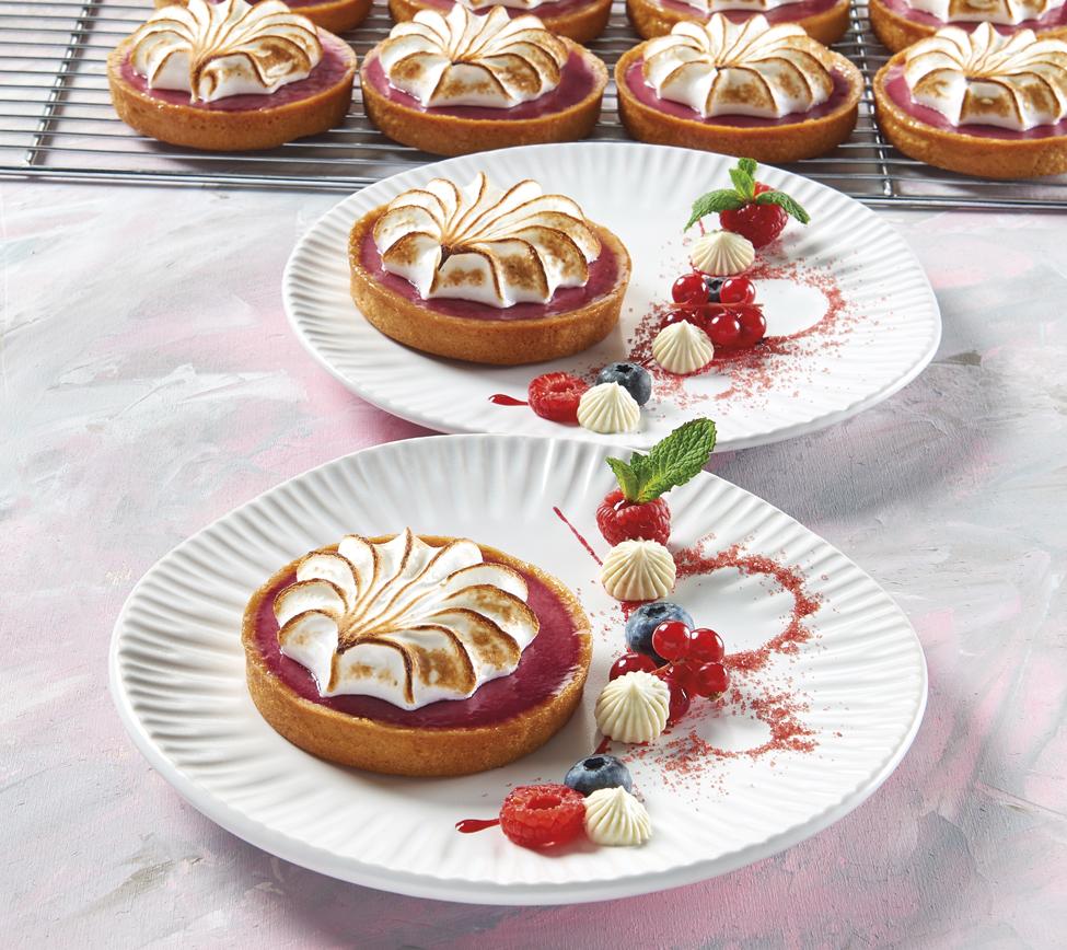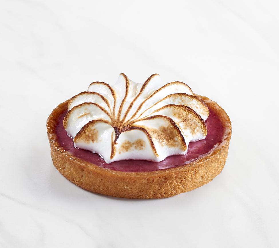 Pâte sucrée pur beurre, gelée et crémeux fruits rouges, meringue à l'italienne pochée.