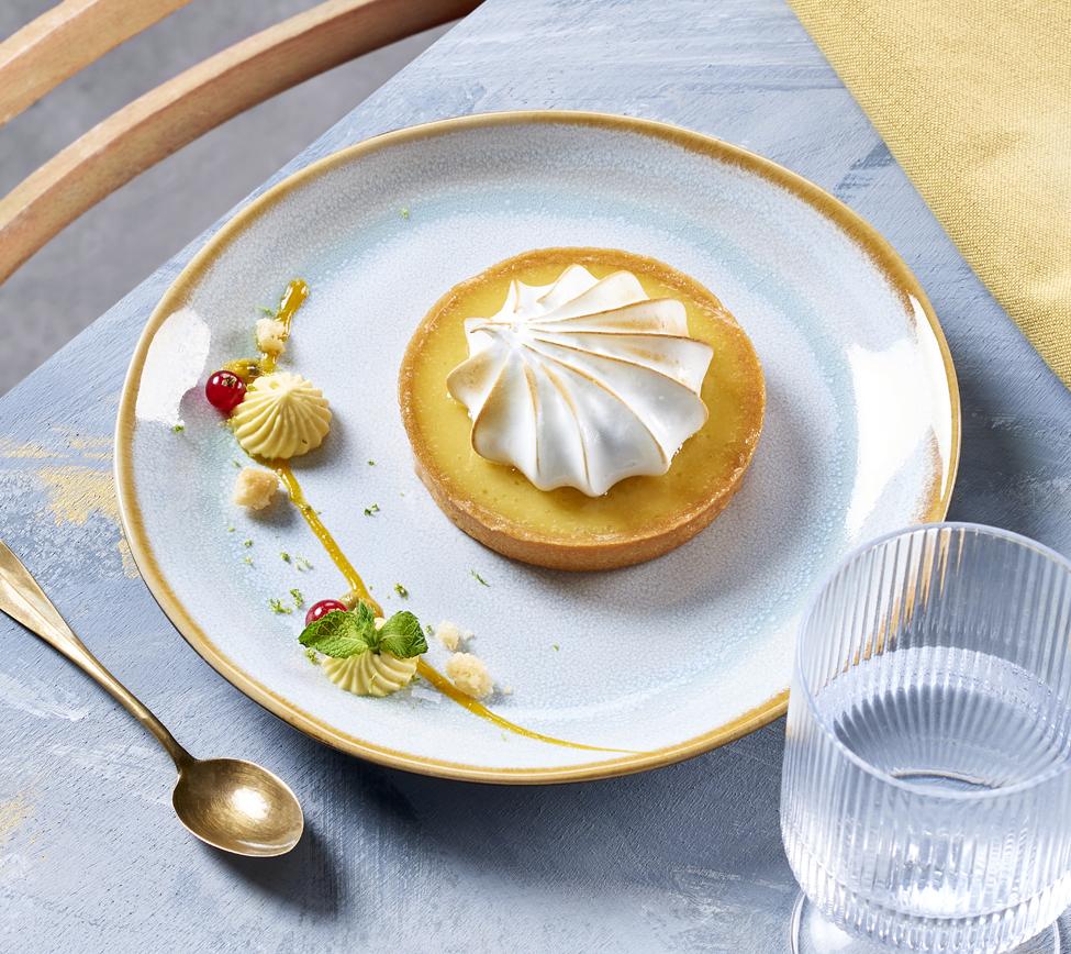 Pâte sucrée pur beurre, gelée et crémeux de fruit de la passion, meringue italienne pochée.