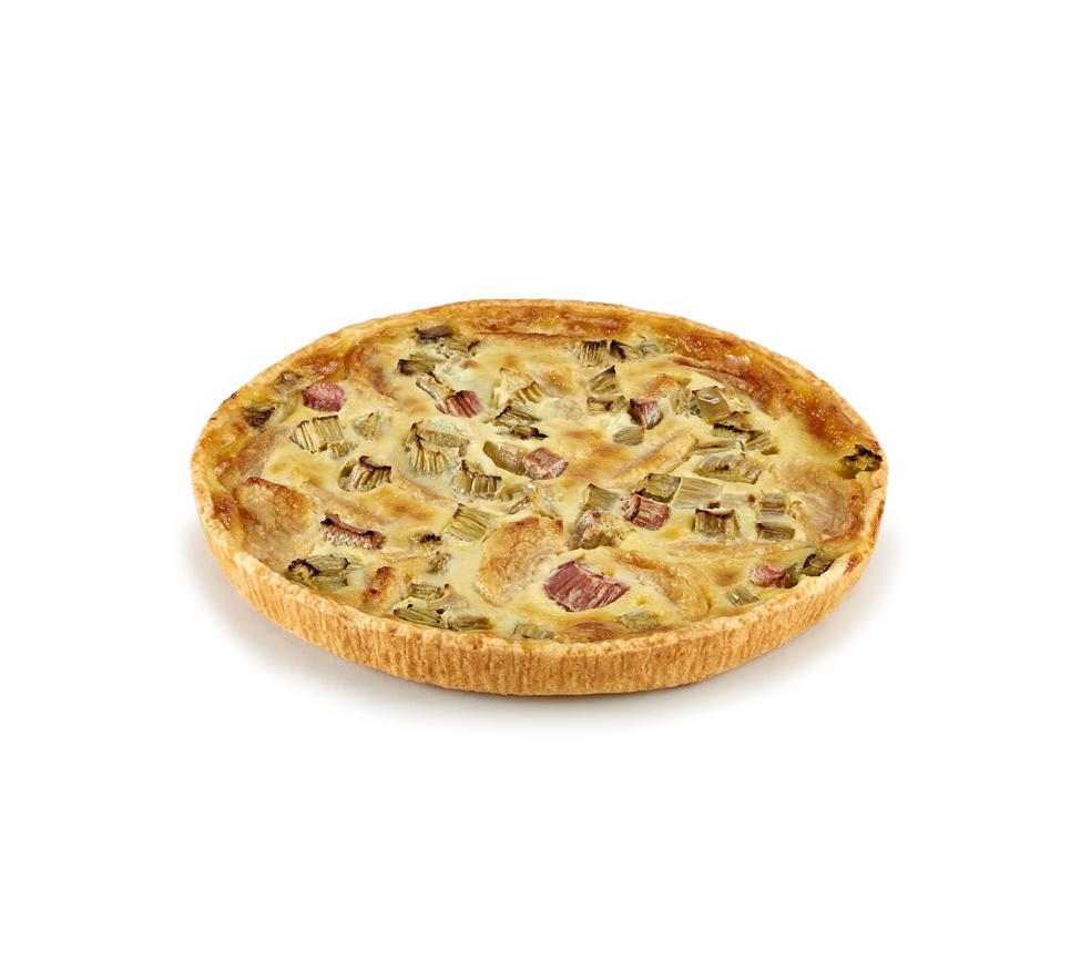 Pâte brisée, appareil aux œufs, quartiers de pommes fraîches et morceaux de rhubarbe. (43% de pommes rhubarbe)